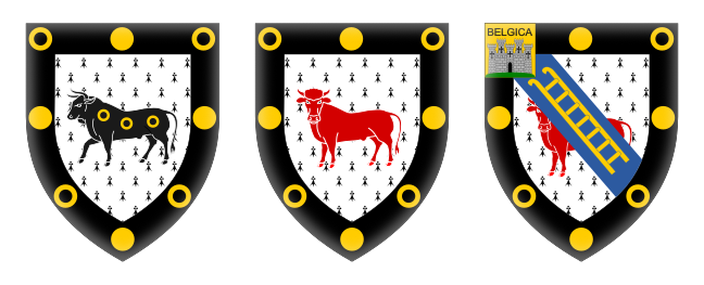 BlazonShield: Ermine, a bull statant at gaze Gules, on a bend Azure a scaling ladder Or, all within a bordure Sable charged with four roundels between four annulets Or, and on a canton Or a mount vert and thereon a castle with five towers Proper, surmounted by the name BELGICA in Sable. The shield is encircled by the circlet, with badge pendant, of a Knight Commander of the Order of the Bath, military division. Crest: out of a naval crown Or a demi-dragon rampant Vert and Gules, charged on the body with three annulets Or, and holding a staff, hanging from which is a flag barry of three Gules, Argent and Azure, the Argent charged with the word BANDA in Sable; above the flag at the peak a pennon of St. George. Motto: Deum Cole, Regem Serva |
