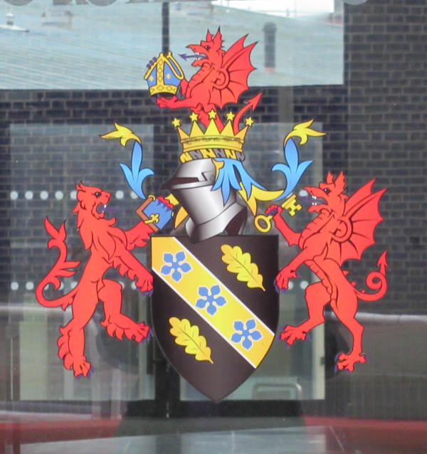 | The full arms on the door of UWTSD's Swansea College of Art, Dynevor. |