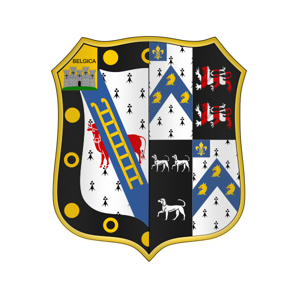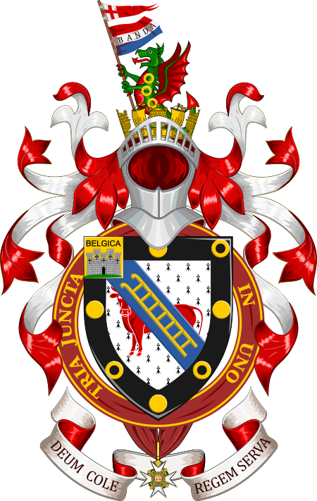 BlazonShield: Ermine, a bull statant at gaze Gules, on a bend Azure a scaling ladder Or, all within a bordure Sable charged with four roundels between four annulets Or, and on a canton Or a mount vert and thereon a castle with five towers Proper, surmounted by the name BELGICA in Sable. The shield is encircled by the circlet, with badge pendant, of a Knight Commander of the Order of the Bath, military division. Crest: out of a naval crown Or a demi-dragon rampant Vert and Gules, charged on the body with three annulets Or, and holding a staff, hanging from which is a flag barry of three Gules, Argent and Azure, the Argent charged with the word BANDA in Sable; above the flag at the peak a pennon of St. George. Motto: Deum Cole, Regem Serva |