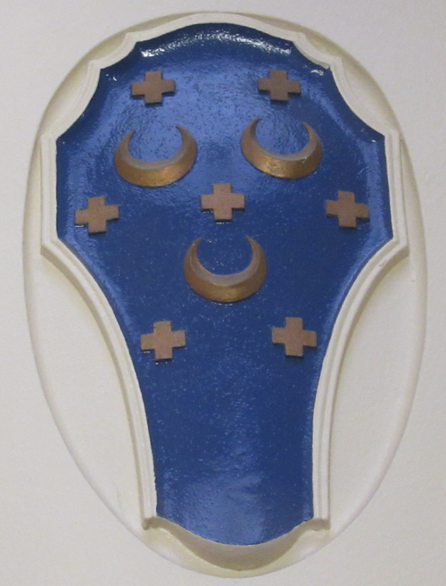 BlazonShield: Azure, three crescents between seven crosses Or. |