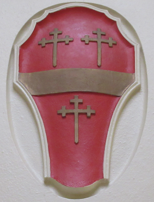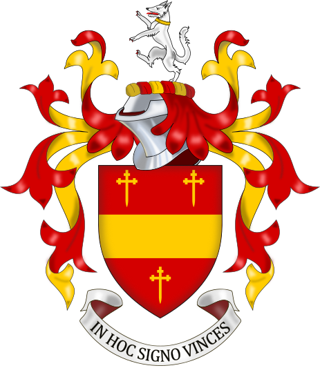 BlazonShield: Gules a fess between three cross crosslets fitchée Or. Crest: A wolf rampant Argent collared Or. Motto : In hoc signo vinces (In this sign you will conquer). |