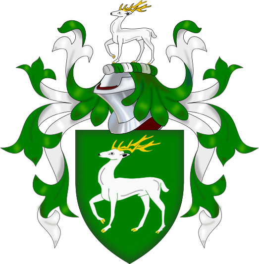 BlazonShield: Vert, a stag trippant Argent attired and unguled Or. Crest: A stag trippant Argent attired and unguled Or. |