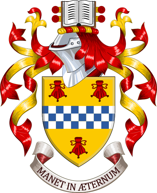 BlazonShield: Or a fess chequey Azure and Argent between three purses Gules. Crest: A book displayed with seals all Proper. Motto: Manet in Æternum. |