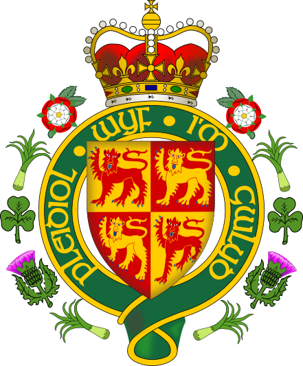 The Principality of Wales never encompassed the whole Welsh nation (most of south and east Wales - the Marcher Lordships - were never in the principality). Despite this, the arms of the principality - of Gwynnedd - are used for the whole country in this badge. They are encircled by a scroll bearing the motto "Pleidiol Wyf I'm Gwlad"(I am true to my country, which is taken from the Welsh national anthem. The circlet is surrounded by the royal plant badges for the four countries of the United Kingdom and surmounted by the royal crown.