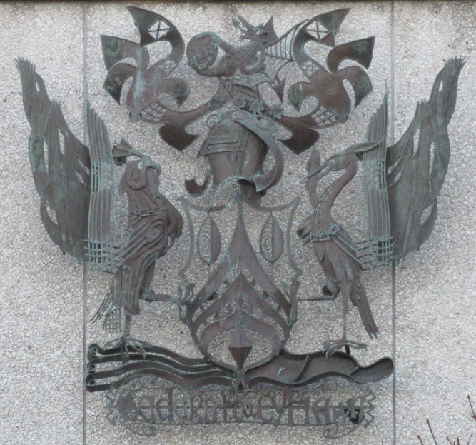 | The arms rendered in metal on Swansea Civic Centre (formerly West Glamorgan County Hall) |
